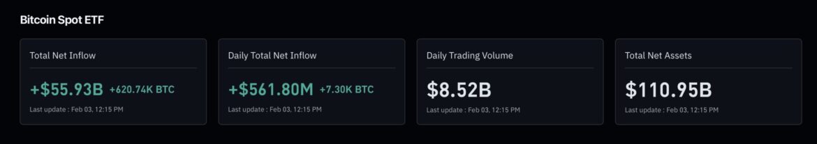 - Recent data shows periods of net outflows, though February 2 recorded inflows aof round $562 million (led by products like FBTC and IBIT), interrupting a prior streak.