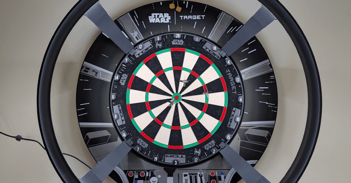 The Target Darts Omni Auto Scoring System pairs with the DartCounter app (Android or iOS). It’s quick and easy to put together, attaching to your board via magnetic legs, but you will need to run the power cable to an outlet. Connect to Wi-Fi, run a short calibration, and it’s time to play. I tested with Target’s Star Wars Millennium Falcon Surround and Dartboard ($200 or £150) and a set of Darth Vader Darts ($340 or £250)—both amazing Star Wars gifts for the fan in your life—but it should work with most boards and any darts.